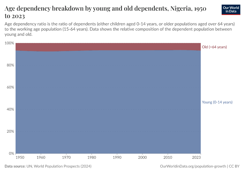 The opposite is true in Nigeria, where almost 94% of dependents there were young in 2021.