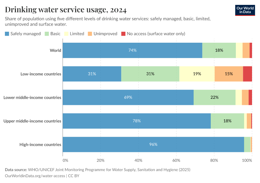 The following chart breaks down drinking water use globally and across regions and income groups. In countries with the lowest incomes, less than one-third of the population uses safely managed water. Most live in Sub-Saharan Africa.
