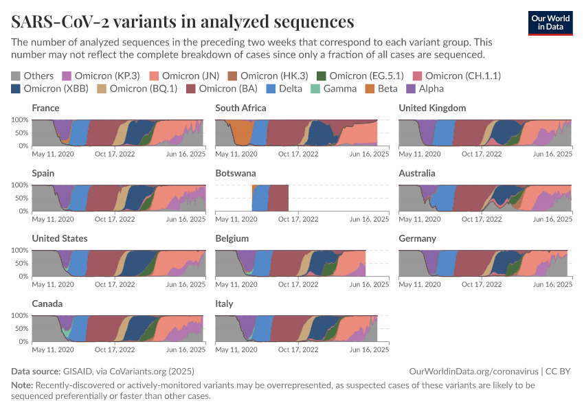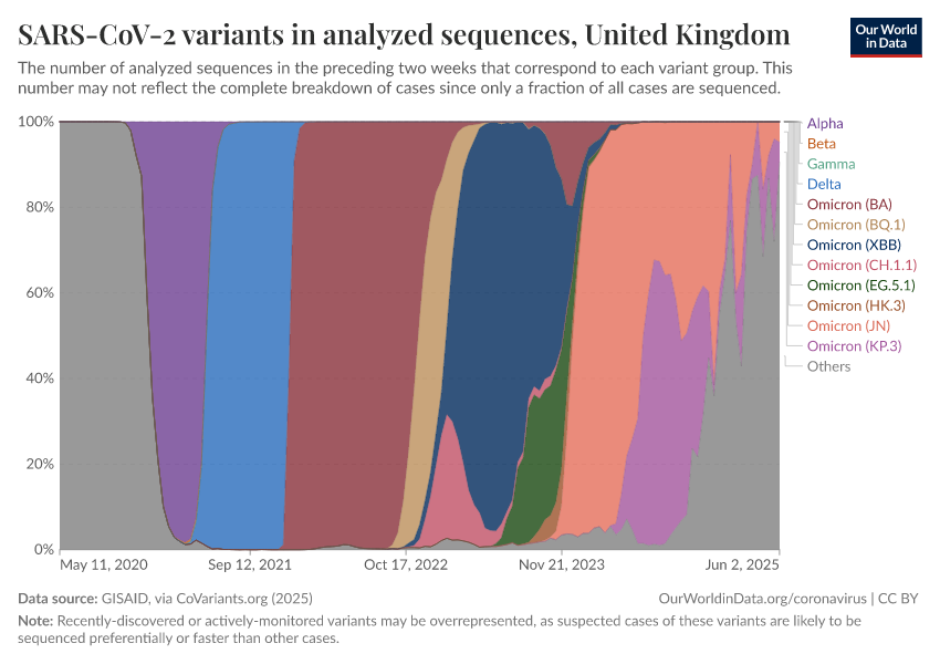 We obtain the share of cases of each variant by dividing the number of sequences labeled for that variant by the total number of sequences. Since only a fraction of all cases have their genome sequenced, this share may not reflect the complete breakdown of cases.