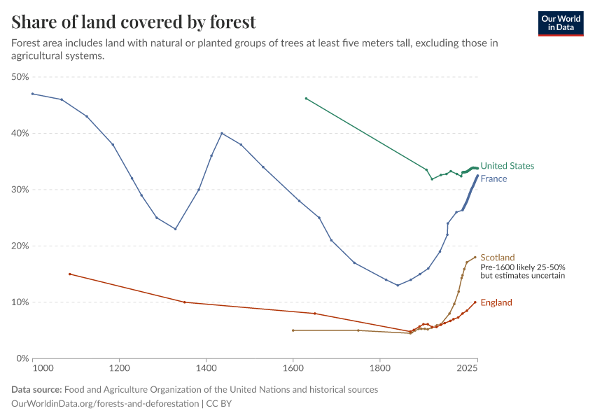 England is similar: in the late 11th century, 15% of the country was forested, and over the following centuries, two-thirds were cut down. By the 19th century, the forest area had been reduced to a third of what it once was. But it was then that England reached its transition point, and since then, forests have doubled in size.