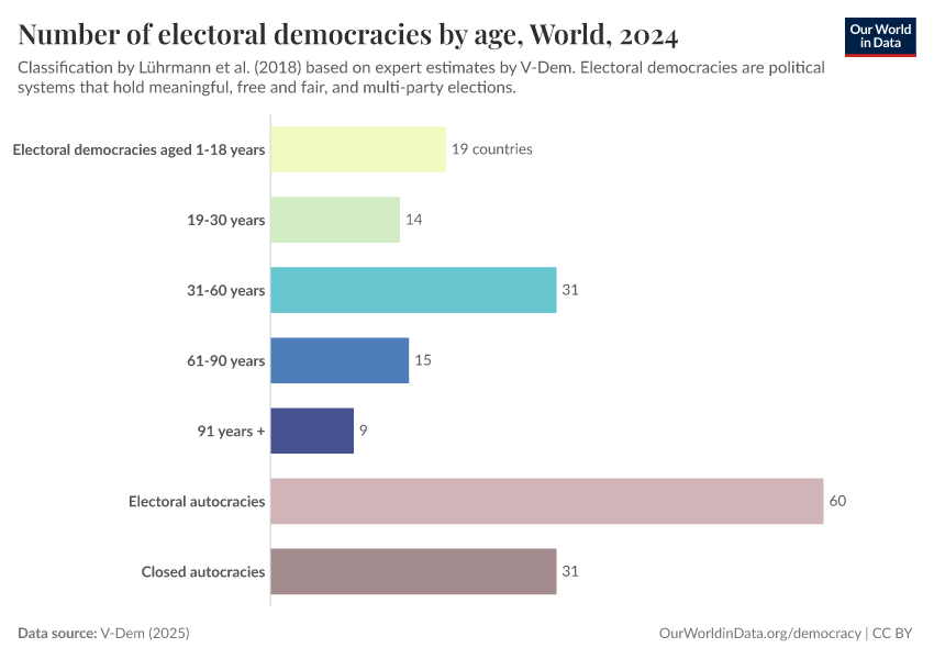 Many democracies are less than a generation old. Twenty of them are younger than 18, not older than a child. These include the democracies in Malawi, Moldova, Nepal, or Sri Lanka. Others are only as old as the country’s young adults, such as the democracies in Croatia, Mexico, South Africa, and Taiwan.