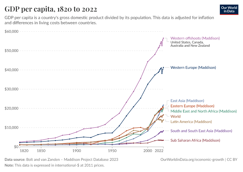 It is also worth keeping in mind that this change has happened while the world population increased 5-fold. Had total global production not increased, the GDP per capita would have declined 5-fold.