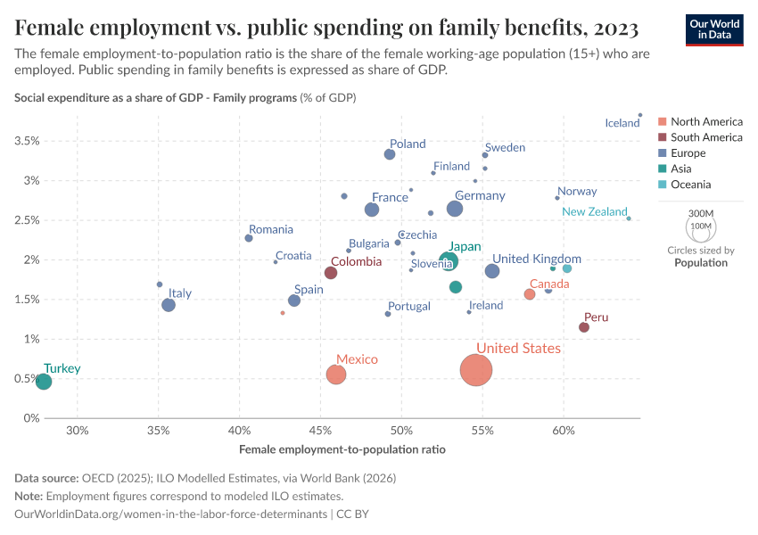 In the chart here, we show that female employment, measured as the employment-to-population ratios for women 15+, tends to be higher in countries with higher levels of public spending on family benefits (i.e. child-related cash transfers to families with children, public spending on services for families with children, and financial support for families provided through the tax system, including tax exemptions).