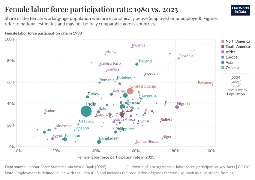 Women’s participation in labor markets differs across regions and countries