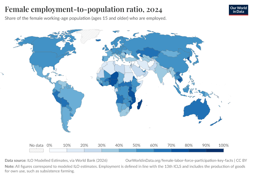 The map here provides a picture of how men and women compare today in terms of participation in labor markets, country by country. Shown is the female-to-male ratio in labor force participation rates (expressed in percent). These figures show estimates from the International Labor Organization (ILO). These are “modeled estimates” in the sense that the ILO produces them after harmonizing various data sources to improve comparability across countries.