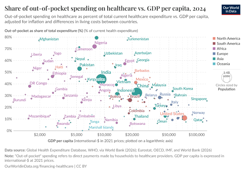 In countries where healthcare is principally financed through public funds, out-of-pocket spending is typically low; this is natural since in these countries there is essentially universal coverage through public insurance (e.g. Cuba, UK, Sweden, France). By the same logic, out-of-pocket spending is also low in countries where healthcare is largely financed through private funds in the form of private voluntary insurance (e.g. US). It is in countries with low public healthcare spending and low private voluntary insurance that out-of-pocket expenditure is high (e.g. India, Afghanistan, Sudan).