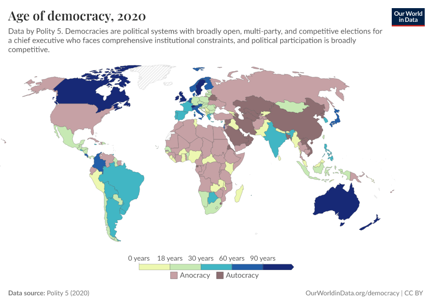 Polity 5 (2020) – processed by Our World in Data. “Age of democracy” [dataset]. Polity 5, “Polity5 Project, Political Regime Characteristics and Transitions, 1800-2018 5” [original data]. Retrieved February 12, 2026 from https://pop-growth-BCE.owid.pages.dev:8789/20250909-093708/grapher/age-of-democracy-polity.html (archived on September 9, 2025).
