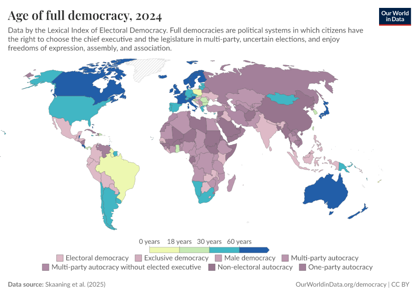 Skaaning et al. (2025) – processed by Our World in Data. “Age of full democracy” [dataset]. Skaaning et al., “Lexical Index of Electoral Democracy (LIED) v6.8” [original data]. Retrieved February 12, 2026 from https://pop-growth-BCE.owid.pages.dev:8789/20260119-065148/grapher/age-of-full-democracy.html (archived on January 19, 2026).