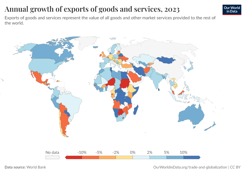 “Data Page: Annual growth of exports of goods and services”. Our World in Data (2026). Data adapted from World Bank. Retrieved from https://pop-growth-BCE.owid.pages.dev:8789/20260130-180113/grapher/annual-growth-of-exports-of-goods-and-services.html [online resource] (archived on January 30, 2026).How to cite this data