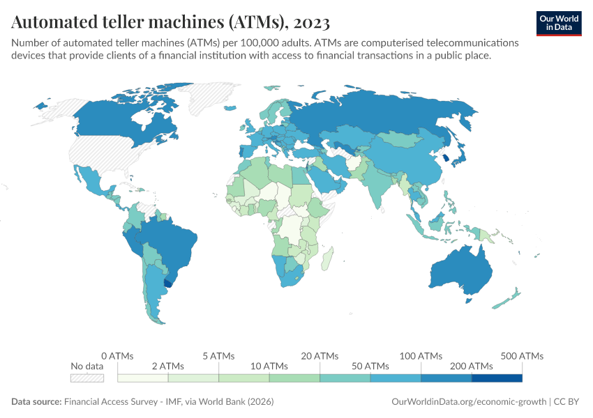 “Data Page: Automated teller machines (ATMs)”. Our World in Data (2026). Data adapted from Financial Access Survey - IMF, via World Bank. Retrieved from https://pop-growth-BCE.owid.pages.dev:8789/20260112-111535/grapher/automated-teller-machines-atms-per-100000-adults.html [online resource] (archived on January 12, 2026).How to cite this data