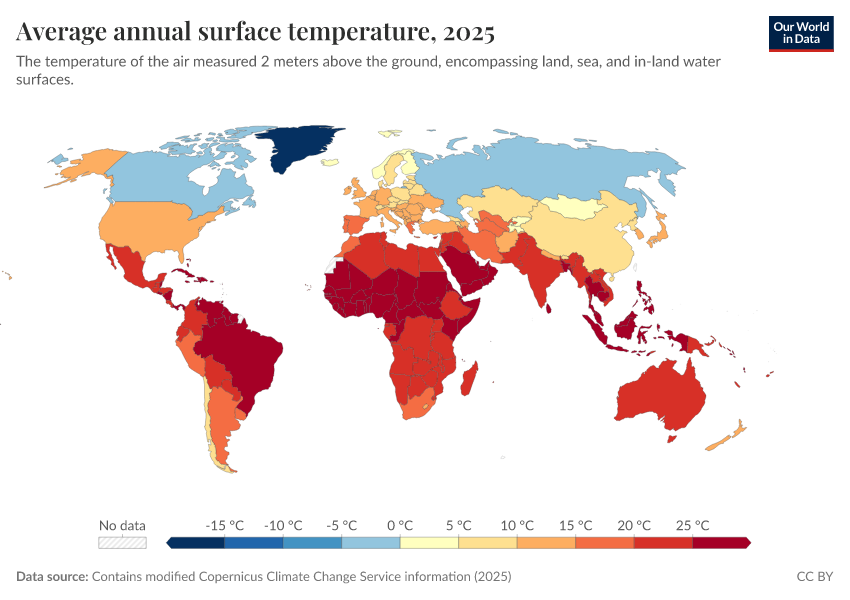 Contains modified Copernicus Climate Change Service information (2025) – with major processing by Our World in Data. “Average annual surface temperature” [dataset]. Contains modified Copernicus Climate Change Service information, “ERA5 monthly averaged data on single levels from 1940 to present 2” [original data]. Retrieved February 12, 2026 from https://pop-growth-BCE.owid.pages.dev:8789/20260114-200738/grapher/average-annual-surface-temperature.html (archived on January 14, 2026).