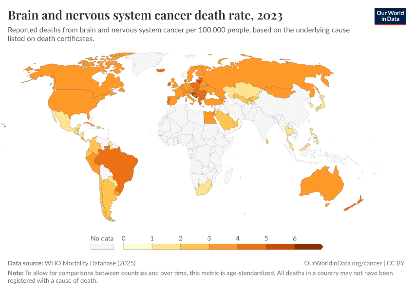 WHO Mortality Database (2025) – with minor processing by Our World in Data. “Brain and nervous system cancer death rate” [dataset]. WHO Mortality Database, “WHO Mortality Database” [original data]. Retrieved February 12, 2026 from https://pop-growth-BCE.owid.pages.dev:8789/20250909-093708/grapher/brain-and-nervous-system-cancer-death-rate.html (archived on September 9, 2025).