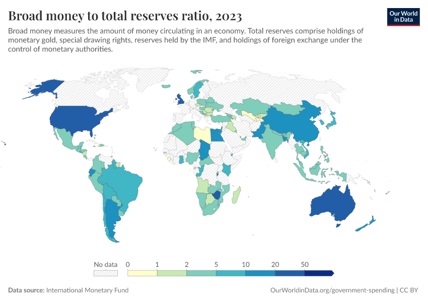 “Data Page: Broad money to total reserves ratio”. Our World in Data (2026). Data adapted from International Monetary Fund. Retrieved from https://pop-growth-BCE.owid.pages.dev:8789/20251120-211749/grapher/broad-money-to-total-reserves-ratio.html [online resource] (archived on November 20, 2025).How to cite this data