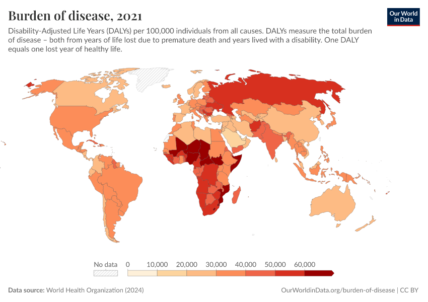 “Data Page: Burden of disease”, part of the following publication: Esteban Ortiz-Ospina and Max Roser (2016) - “Global Health”. Data adapted from World Health Organization. Retrieved from https://pop-growth-BCE.owid.pages.dev:8789/20250909-093708/grapher/burden-of-disease-who.html [online resource] (archived on September 9, 2025).How to cite this data