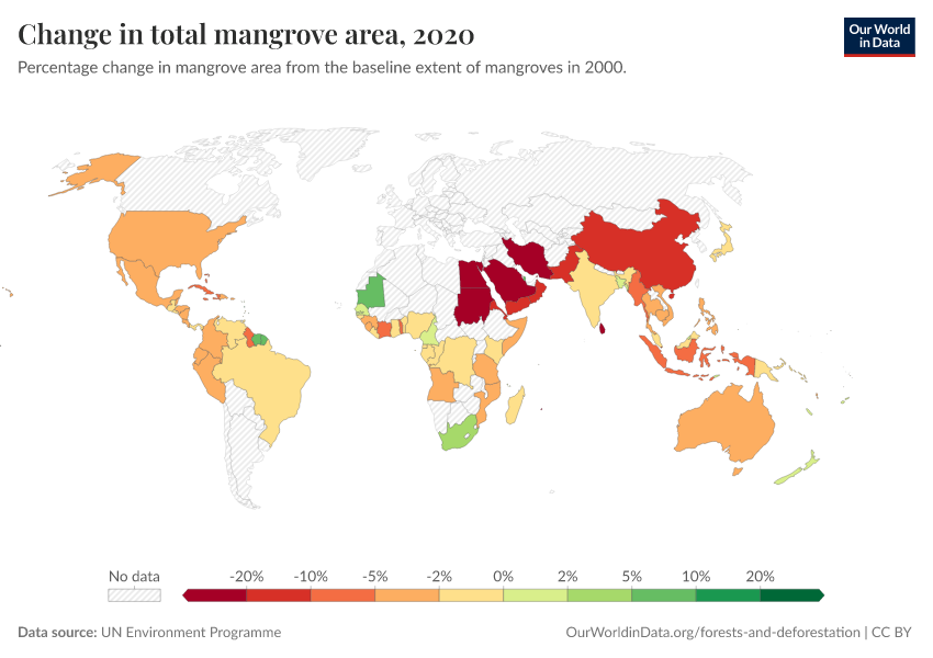“Data Page: Change in total mangrove area”. Our World in Data (2026). Data adapted from UN Environment Programme. Retrieved from https://pop-growth-BCE.owid.pages.dev:8789/20260130-180113/grapher/change-in-total-mangrove-area.html [online resource] (archived on January 30, 2026).How to cite this data
