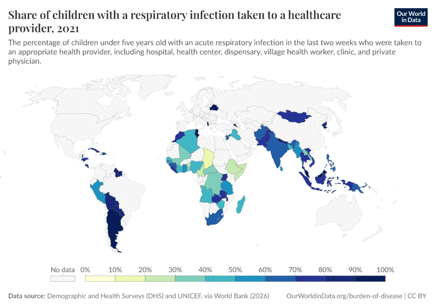 Demographic and Health Surveys (DHS) and UNICEF, via World Bank (2025) – processed by Our World in Data. “Share of children with a respiratory infection taken to a healthcare provider ” [dataset]. Demographic and Health Surveys (DHS) and UNICEF, via World Bank, “World Development Indicators 122” [original data]. Retrieved February 12, 2026 from https://pop-growth-BCE.owid.pages.dev:8789/20260112-111535/grapher/children-treated-ari.html (archived on January 12, 2026).