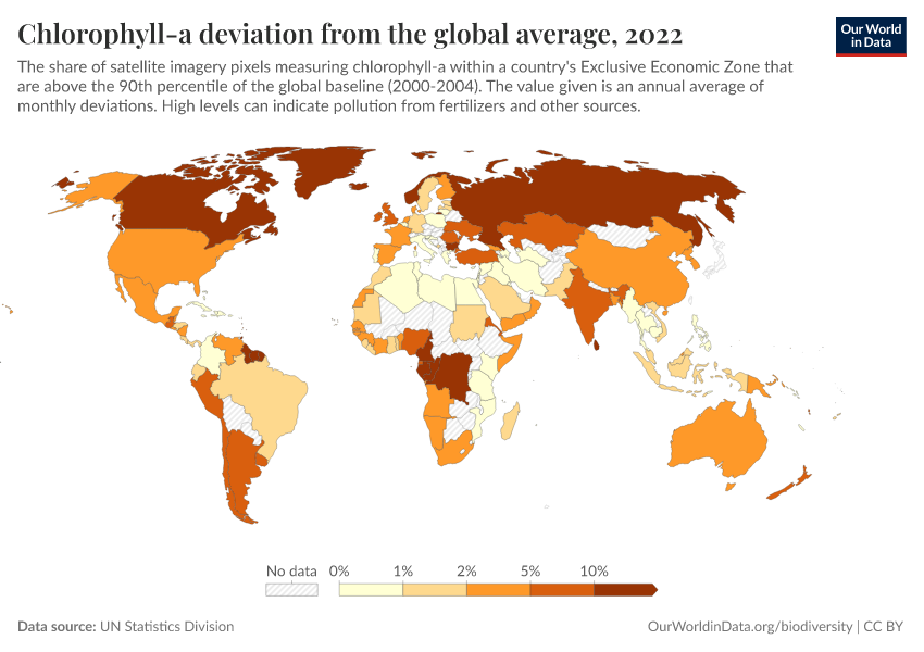 UN Statistics Division – processed by Our World in Data. “Chlorophyll-a deviation from the global average” [dataset]. UN Statistics Division, “World Environment Situation Room” [original data]. Retrieved February 12, 2026 from https://pop-growth-BCE.owid.pages.dev:8789/20260130-180113/grapher/chlorophyll-a-deviation-from-the-global-average.html (archived on January 30, 2026).