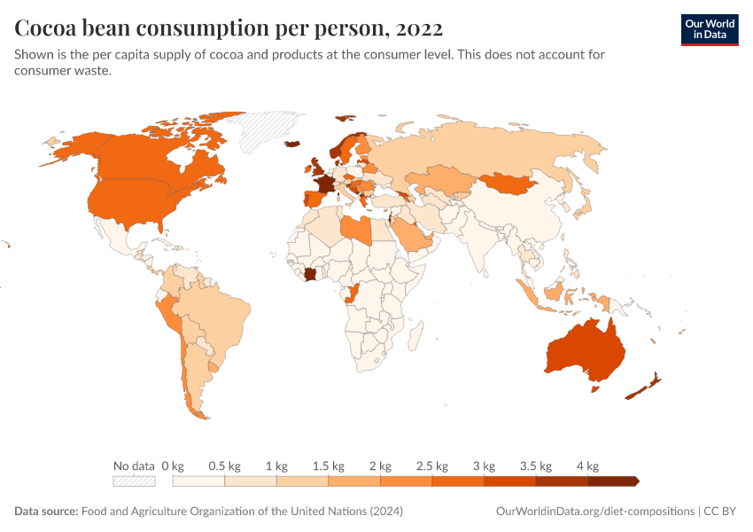 “Data Page: Yearly per capita supply of cocoa beans”. Our World in Data (2026). Data adapted from Food and Agriculture Organization of the United Nations. Retrieved from https://pop-growth-BCE.owid.pages.dev:8789/20260116-144923/grapher/chocolate-consumption-per-person.html [online resource] (archived on January 16, 2026).How to cite this data
