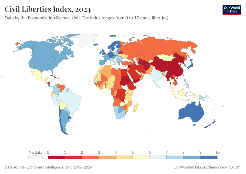 Economist Intelligence Unit (2006-2024) – processed by Our World in Data. “Civil Liberties Index” [dataset]. Economist Intelligence Unit, “Democracy Index 2021: The China challenge”; Economist Intelligence Unit, “Democracy Index 2022: Frontline democracy and the battle for Ukraine”; Economist Intelligence Unit, “Democracy Index 2023: Age of Conflict”; Economist Intelligence Unit, “Democracy Index 2024: What's wrong with representative democracy?”; Gapminder, “Democracy Index v4”; Various sources, “Population” [original data]. Retrieved February 12, 2026 from https://pop-growth-BCE.owid.pages.dev:8789/20260119-070102/grapher/civil-liberties-index-eiu.html (archived on January 19, 2026).