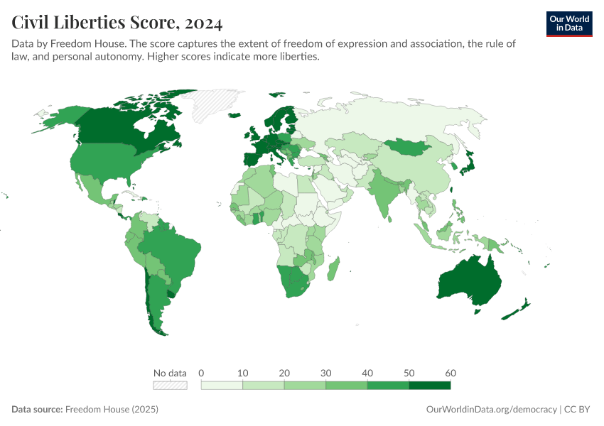 “Data Page: Civil liberties score”, part of the following publication: Bastian Herre, Lucas Rodés-Guirao, and Esteban Ortiz-Ospina (2013) - “Democracy”. Data adapted from Freedom House. Retrieved from https://pop-growth-BCE.owid.pages.dev:8789/20260119-070102/grapher/civil-liberties-score-fh.html [online resource] (archived on January 19, 2026).How to cite this data