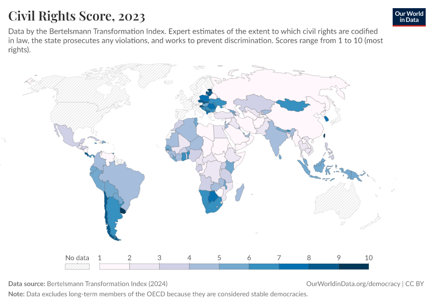 “Data Page: Civil rights score”, part of the following publication: Bastian Herre, Lucas Rodés-Guirao, and Esteban Ortiz-Ospina (2013) - “Democracy”. Data adapted from Bertelsmann Transformation Index. Retrieved from https://pop-growth-BCE.owid.pages.dev:8789/20260105-133053/grapher/civil-rights-score-bti.html [online resource] (archived on January 5, 2026).How to cite this data