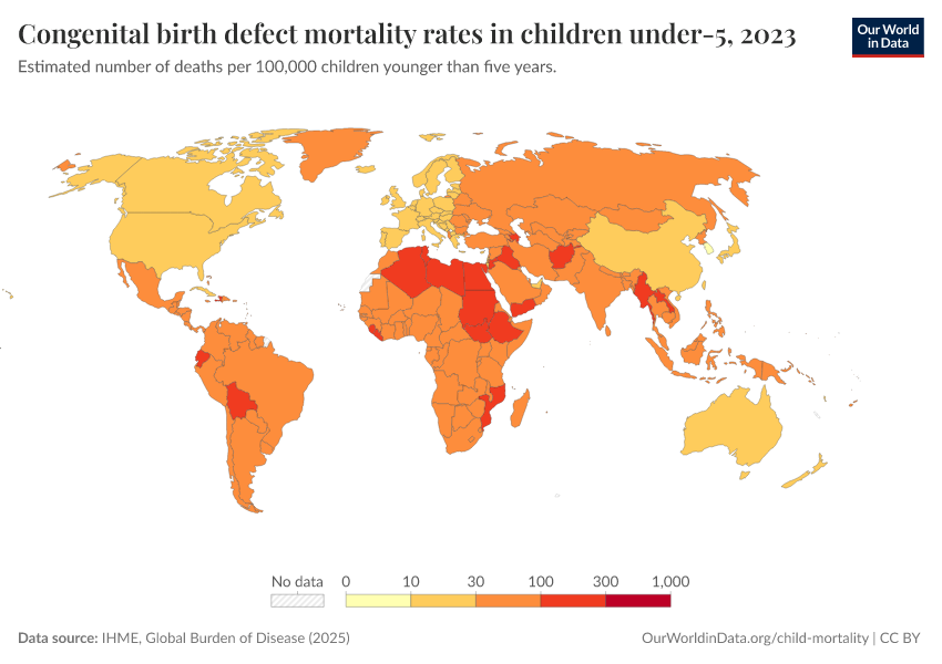 IHME, Global Burden of Disease (2024) – with minor processing by Our World in Data. “Congenital birth defect mortality rates in children under-5” [dataset]. IHME, Global Burden of Disease, “Global Burden of Disease - Deaths and DALYs” [original data]. Retrieved February 12, 2026 from https://pop-growth-BCE.owid.pages.dev:8789/20250909-093708/grapher/congenital-birth-defect-mortality-rates-in-children-under-5.html (archived on September 9, 2025).