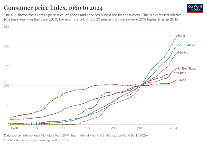 “Data Page: Consumer price index”. Our World in Data (2026). Data adapted from International Monetary Fund (IMF) International Financial Statistics, via World Bank. Retrieved from https://pop-growth-BCE.owid.pages.dev:8789/20251220-152415/grapher/consumer-price-index.html [online resource] (archived on December 20, 2025).How to cite this data