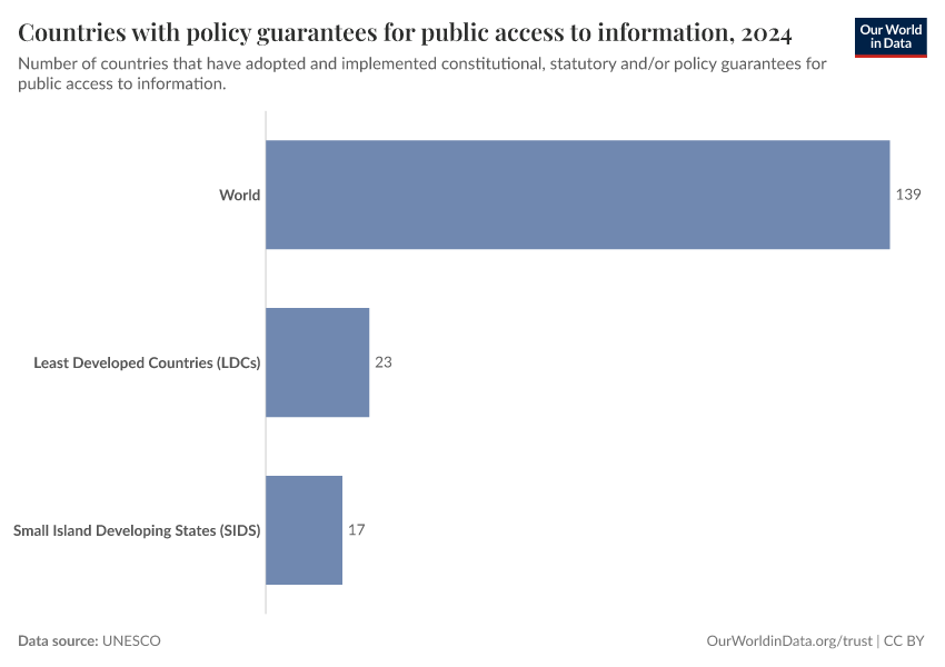 “Data Page: Countries with policy guarantees for public access to information”. Our World in Data (2026). Data adapted from UNESCO. Retrieved from https://pop-growth-BCE.owid.pages.dev:8789/20260130-180113/grapher/countries-that-adopt-guarantees-for-public-access-to-information.html [online resource] (archived on January 30, 2026).How to cite this data