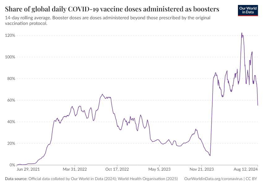 Official data collated by Our World in Data (2024); World Health Organisation (2025) – with major processing by Our World in Data. “Share of global daily COVID-19 vaccine doses administered as boosters” [dataset]. Official data collated by Our World in Data, “COVID-19, vaccinations”; World Health Organisation, “COVID-19, vaccinations (WHO)” [original data]. Retrieved February 12, 2026 from https://pop-growth-BCE.owid.pages.dev:8789/20250909-093708/grapher/covid-vaccine-share-boosters.html (archived on September 9, 2025).