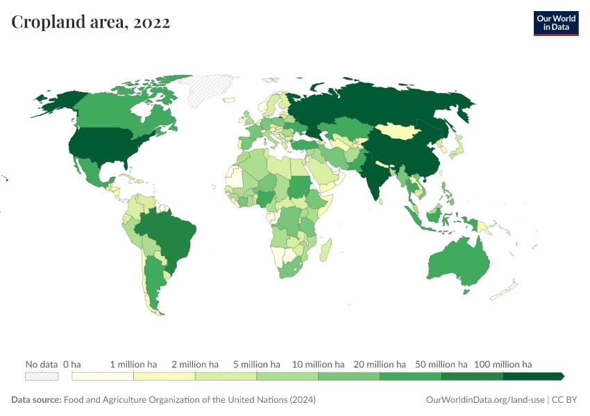 “Data Page: Cropland area”, part of the following publication: Hannah Ritchie, Pablo Rosado, and Max Roser (2023) - “Agricultural Production”. Data adapted from Food and Agriculture Organization of the United Nations. Retrieved from https://pop-growth-BCE.owid.pages.dev:8789/20260119-235736/grapher/cropland-area.html [online resource] (archived on January 19, 2026).How to cite this data