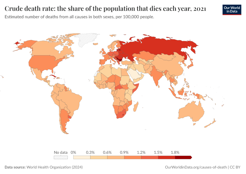 “Data Page: Crude death rate: the share of the population that dies each year”, part of the following publication: Esteban Ortiz-Ospina and Max Roser (2016) - “Global Health”. Data adapted from World Health Organization. Retrieved from https://pop-growth-BCE.owid.pages.dev:8789/20250909-093708/grapher/crude-death-rate-the-share-of-the-population-that-dies-each-year-who.html [online resource] (archived on September 9, 2025).How to cite this data