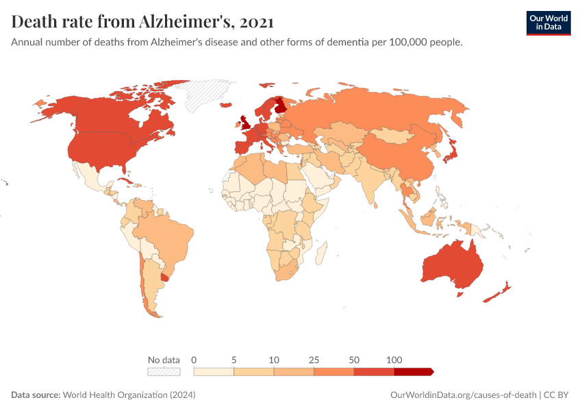 World Health Organization (2024) – with major processing by Our World in Data. “Death rate from Alzheimer's” [dataset]. World Health Organization, “Global Health Estimates” [original data]. Retrieved February 12, 2026 from https://pop-growth-BCE.owid.pages.dev:8789/20250909-093708/grapher/death-rate-from-alzheimers-other-dementias-ghe.html (archived on September 9, 2025).