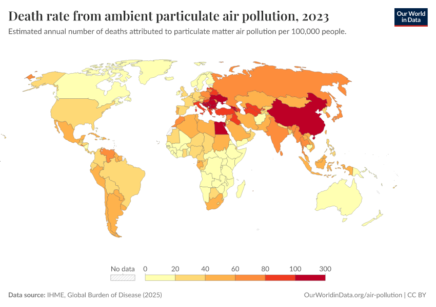 IHME, Global Burden of Disease (2024) – with minor processing by Our World in Data. “Death rate from ambient particulate air pollution” [dataset]. IHME, Global Burden of Disease, “Global Burden of Disease - Risk Factors” [original data]. Retrieved February 12, 2026 from https://pop-growth-BCE.owid.pages.dev:8789/20250909-093708/grapher/death-rate-from-ambient-particulate-air-pollution.html (archived on September 9, 2025).