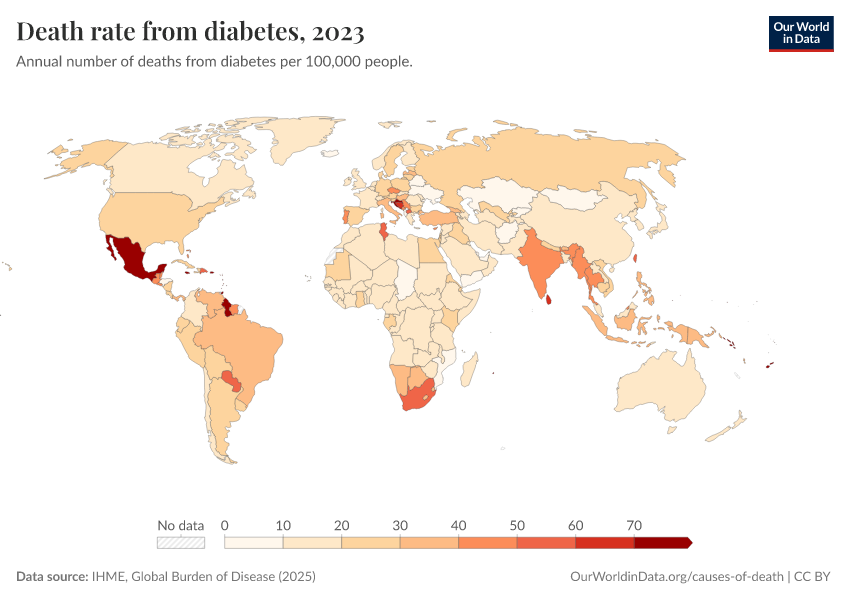 “Data Page: Death rate from diabetes”, part of the following publication: Esteban Ortiz-Ospina and Max Roser (2016) - “Global Health”. Data adapted from IHME, Global Burden of Disease. Retrieved from https://pop-growth-BCE.owid.pages.dev:8789/20250909-093708/grapher/death-rate-from-diabetes-gbd.html [online resource] (archived on September 9, 2025).How to cite this data