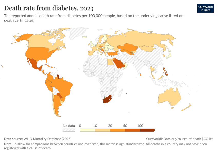 “Data Page: Death rate from diabetes”, part of the following publication: Saloni Dattani, Fiona Spooner, Hannah Ritchie, and Max Roser (2023) - “Causes of Death”. Data adapted from WHO Mortality Database. Retrieved from https://pop-growth-BCE.owid.pages.dev:8789/20250909-093708/grapher/death-rate-from-diabetes-who-mdb.html [online resource] (archived on September 9, 2025).How to cite this data