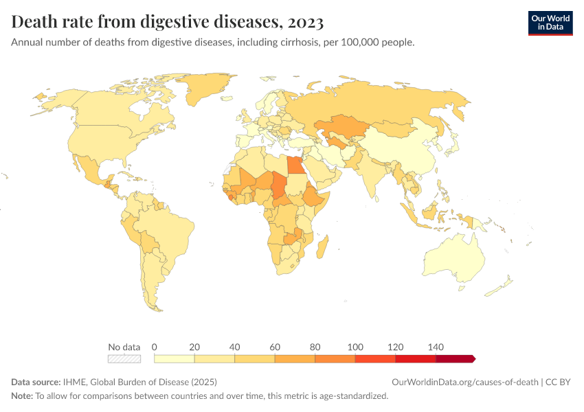 IHME, Global Burden of Disease (2024) – with minor processing by Our World in Data. “Death rate from digestive diseases” [dataset]. IHME, Global Burden of Disease, “Global Burden of Disease - Deaths and DALYs” [original data]. Retrieved February 12, 2026 from https://pop-growth-BCE.owid.pages.dev:8789/20250909-093708/grapher/death-rate-from-digestive-diseases.html (archived on September 9, 2025).