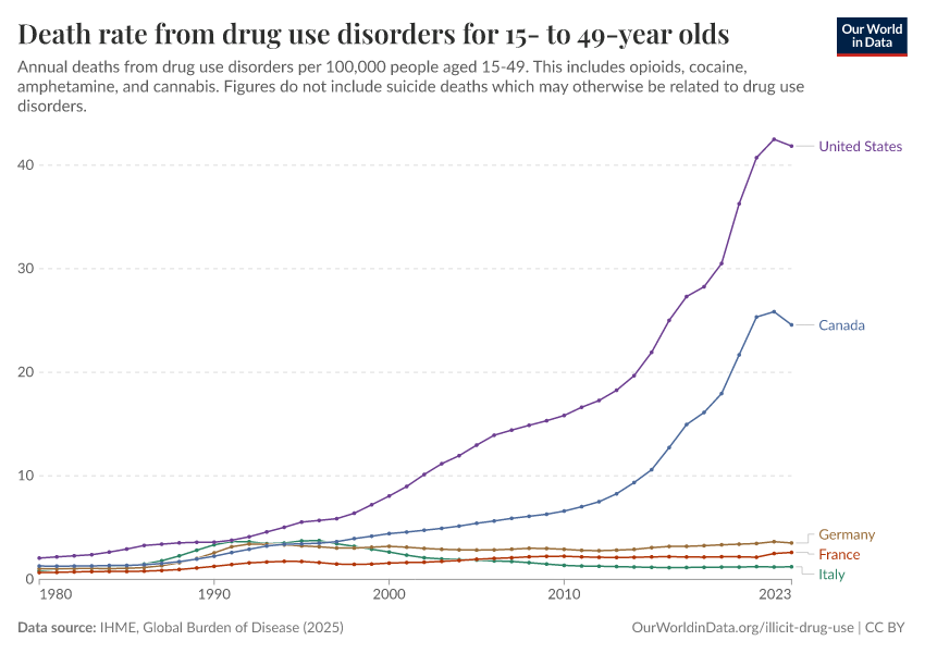 IHME, Global Burden of Disease (2024) – with minor processing by Our World in Data. “Death rate from drug use disorders for 15- to 49-year olds” [dataset]. IHME, Global Burden of Disease, “Global Burden of Disease - Deaths and DALYs” [original data]. Retrieved February 12, 2026 from https://pop-growth-BCE.owid.pages.dev:8789/20250909-093708/grapher/death-rate-from-drug-use-disorders-for-15--to-49-year-olds.html (archived on September 9, 2025).