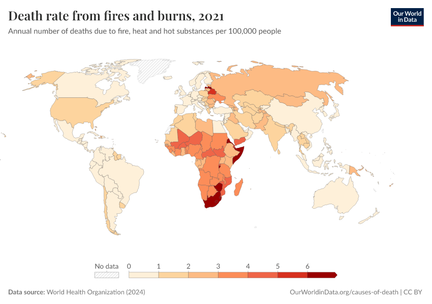 World Health Organization (2024) – with major processing by Our World in Data. “Death rate from fires and burns” [dataset]. World Health Organization, “Global Health Estimates” [original data]. Retrieved February 12, 2026 from https://pop-growth-BCE.owid.pages.dev:8789/20250909-093708/grapher/death-rate-from-fires-and-burns-who.html (archived on September 9, 2025).