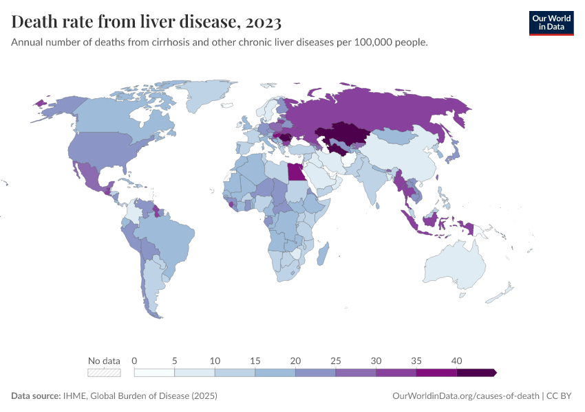 IHME, Global Burden of Disease (2024) – with minor processing by Our World in Data. “Death rate from liver disease” [dataset]. IHME, Global Burden of Disease, “Global Burden of Disease - Deaths and DALYs” [original data]. Retrieved February 12, 2026 from https://pop-growth-BCE.owid.pages.dev:8789/20250909-093708/grapher/death-rate-from-liver-disease-gbd.html (archived on September 9, 2025).