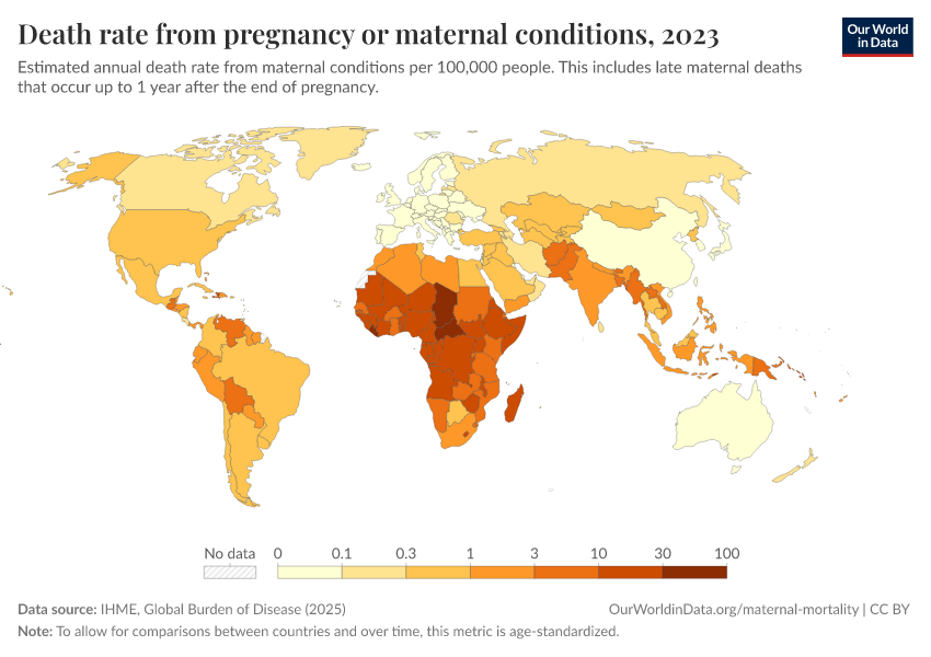 IHME, Global Burden of Disease (2024) – with minor processing by Our World in Data. “Death rate from pregnancy or maternal conditions” [dataset]. IHME, Global Burden of Disease, “Global Burden of Disease - Deaths and DALYs” [original data]. Retrieved February 12, 2026 from https://pop-growth-BCE.owid.pages.dev:8789/20250909-093708/grapher/death-rate-from-maternal-disorders-ihme.html (archived on September 9, 2025).