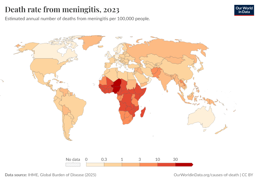 “Data Page: Death rate from meningitis”, part of the following publication: Esteban Ortiz-Ospina and Max Roser (2016) - “Global Health”. Data adapted from IHME, Global Burden of Disease. Retrieved from https://pop-growth-BCE.owid.pages.dev:8789/20250909-093708/grapher/death-rate-from-meningitis-gbd.html [online resource] (archived on September 9, 2025).How to cite this data