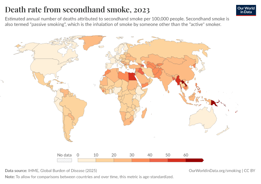 IHME, Global Burden of Disease (2024) – with minor processing by Our World in Data. “Death rate from secondhand smoke” [dataset]. IHME, Global Burden of Disease, “Global Burden of Disease - Risk Factors” [original data]. Retrieved February 12, 2026 from https://pop-growth-BCE.owid.pages.dev:8789/20250909-093708/grapher/death-rate-from-secondhand-smoke.html (archived on September 9, 2025).