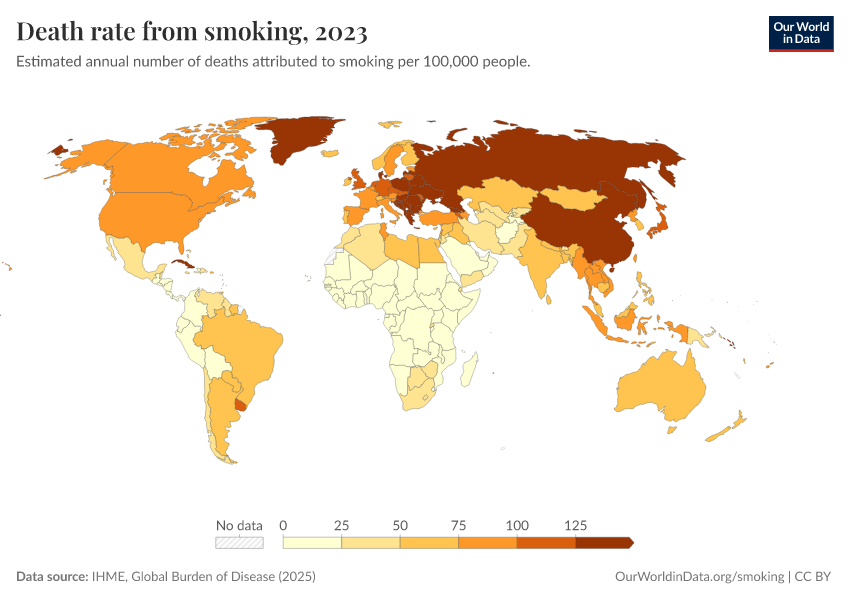 IHME, Global Burden of Disease (2024) – with minor processing by Our World in Data. “Death rate from smoking” [dataset]. IHME, Global Burden of Disease, “Global Burden of Disease - Risk Factors” [original data]. Retrieved February 12, 2026 from https://pop-growth-BCE.owid.pages.dev:8789/20250909-093708/grapher/death-rate-from-smoking.html (archived on September 9, 2025).