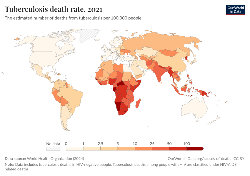 World Health Organization (2024) – with major processing by Our World in Data. “Tuberculosis death rate” [dataset]. World Health Organization, “Global Health Estimates” [original data]. Retrieved February 12, 2026 from https://pop-growth-BCE.owid.pages.dev:8789/20250909-093708/grapher/death-rate-from-tuberculosis-ghe.html (archived on September 9, 2025).