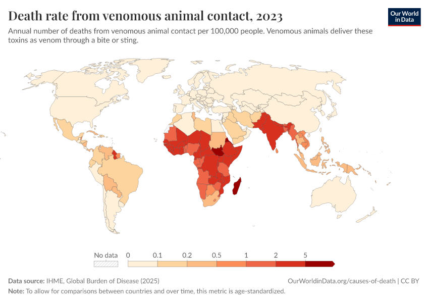 IHME, Global Burden of Disease (2024) – with minor processing by Our World in Data. “Death rate from venomous animal contact” [dataset]. IHME, Global Burden of Disease, “Global Burden of Disease - Deaths and DALYs” [original data]. Retrieved February 12, 2026 from https://pop-growth-BCE.owid.pages.dev:8789/20250909-093708/grapher/death-rate-from-venomous-animal.html (archived on September 9, 2025).