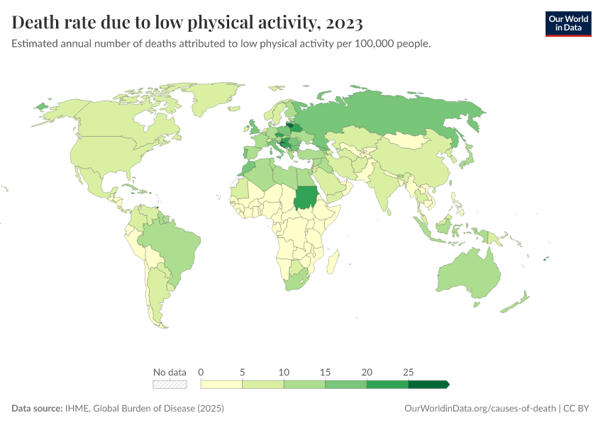 “Data Page: Death rate due to low physical activity”, part of the following publication: Esteban Ortiz-Ospina and Max Roser (2016) - “Global Health”. Data adapted from IHME, Global Burden of Disease. Retrieved from https://pop-growth-BCE.owid.pages.dev:8789/20250909-093708/grapher/death-rates-due-to-low-physical-activity-gbd.html [online resource] (archived on September 9, 2025).How to cite this data