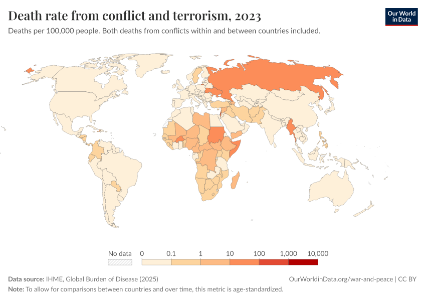 IHME, Global Burden of Disease (2024) – with minor processing by Our World in Data. “Death rate from conflict and terrorism” [dataset]. IHME, Global Burden of Disease, “Global Burden of Disease - Deaths and DALYs” [original data]. Retrieved February 12, 2026 from https://pop-growth-BCE.owid.pages.dev:8789/20250909-093708/grapher/death-rates-from-conflict-and-terrorism-gbd.html (archived on September 9, 2025).