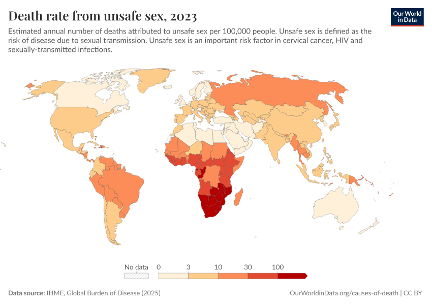 “Data Page: Death rate from unsafe sex”, part of the following publication: Esteban Ortiz-Ospina and Max Roser (2016) - “Global Health”. Data adapted from IHME, Global Burden of Disease. Retrieved from https://pop-growth-BCE.owid.pages.dev:8789/20250909-093708/grapher/death-rates-from-unsafe-sex-gbd.html [online resource] (archived on September 9, 2025).How to cite this data