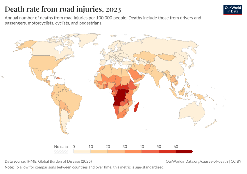 “Data Page: Death rate from road injuries”, part of the following publication: Esteban Ortiz-Ospina and Max Roser (2016) - “Global Health”. Data adapted from IHME, Global Burden of Disease. Retrieved from https://pop-growth-BCE.owid.pages.dev:8789/20251029-110753/grapher/death-rates-road-incidents.html [online resource] (archived on October 29, 2025).How to cite this data
