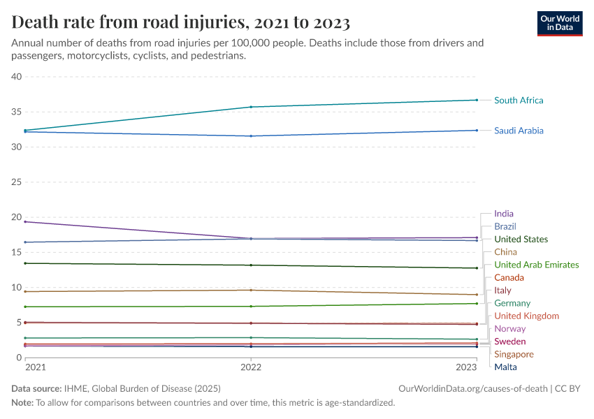 “Data Page: Death rate from road injuries”, part of the following publication: Esteban Ortiz-Ospina and Max Roser (2016) - “Global Health”. Data adapted from IHME, Global Burden of Disease. Retrieved from https://pop-growth-BCE.owid.pages.dev:8789/20251029-110753/grapher/death-rates-road-incidents.html [online resource] (archived on October 29, 2025).